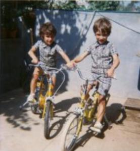 Sendo eu o primogénito, no dia do meu quinto aniversário tive o privilégio de ser o primeiro a conhecer aquela que marcou as pedaladas de infância. Era uma Orbita de uma cor invulgar, num tom verde “bisga”, com pneus brancos, rodinhas extra, desdobrável e sem velocidades. O suficiente para começar a pedalar e deixar de vez o triciclo esquecido a um canto. Passados três meses e tal foi a vez do meu irmão receber a sua e parar de embirrar. Olhando a fotografia com atenção, dou conta como aquele pátio era pequeno, mas na altura parecia-me haver muito espaço para dar aos pedais.