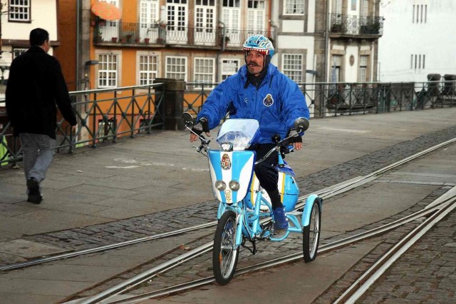 A foto não é minha. Recebia por e-mail faz uns anitos. É apenas mais um adepto do Futebol Clube do Porto, mas este não é um adepto qualquer. Não sei o seu nome mas quem andar pelas ruas do Porto já deve ter passado por esta simpática figura da cidade, sempre equipado a rigor. É quase impossível não dar conta do som estridente que sai do seu original e vistoso triciclo. E, como podem ver, não será difícil perceber porque o coloquei hoje a pedalar nabicicleta, quando o nosso clube acaba de completar um triciclo de sucessos.