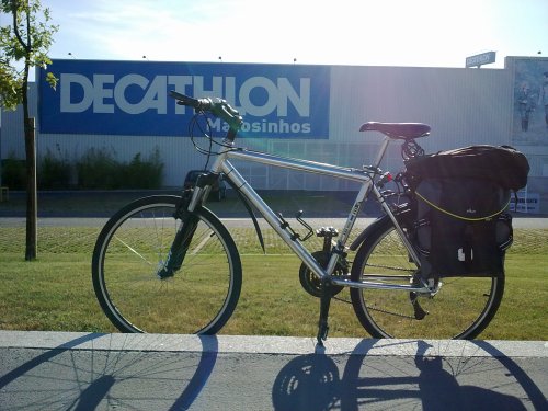 Para uma viagem tripartida por vários dias e km’s q.b., atravessando bosques, passando por aldeias minhotas e paisagens galegas, o calçado que a Etielbina usa para as minhas urbanidades não se coaduna com calhaus soltos e caminhos de cabras. Vai daí, matutei qual seria o pneumático mais em conta dos chamados “cross country”. Pesquisei e encontrei umas solas em conta para empreender tal viagem. E antes mesmo de dar ao pedal até à mega-superfície-das-coisas-jeitosas, dei um pouco mais às teclas até encontrar os alforges (coisa que já havia pensado sem ter ainda encontrado as ideais). A velha mochila que usava pendurada no bagageiro lá ia desenrascando mas o que eu preciso é de uma coisa de qualidade, razoável capacidade de carga, que desse para se separar e usar um de cada vez. Touché.