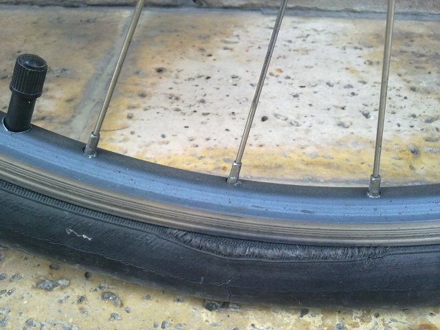 No meu percurso laboral habitual, depois de passar a Travessa, entre a Quinta e o Hospital da Prelada, levanto o rabo do selim e atalho caminho por uma passagem que existe de terra e pedras. Ontem a ida não foi excepção, mas passado o asfalto esburacado da Sarmento de Beires, já a subir para o Carvalhido, a Etielbina gingava num estranho passo doble vindo da roda traseira. Resumindo, estava coxa. – Queres ver que furou!, pensei. Mas não, não detive a pedalada e só à chegada é que dei conta do pneu traseiro rasgado. – Ok, já estava muuuiiito usado, mas tinha de rasgar? Ainda bem que não furou!