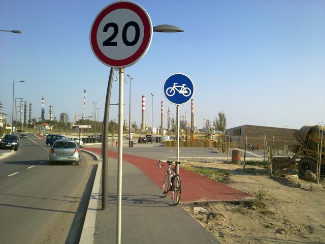Como se pode ver a tarde estava convidativa para pedalar. Encostei a bicla ao poste que segura um sinal azul, indicador do início de uma via reservada às bicicletas, que do meu ponto de vista e neste caso, não passa de uma extensão do passeio pedonal à beira mar plantado. Permiti que em primeiro plano ficasse um outro sinal, este de proibição, que julgo saber na teoria limita a velocidade dos veículos motorizados a 20 km/h. Quanto à prática já estamos conversados.