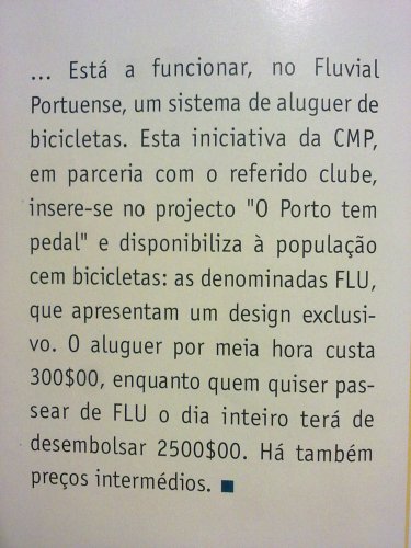 Bugas, Lagoas, BiCas, BIP’s e Rainhas são algumas das possibilidades quando as pessoas em Aveiro, Ponte de Lima, Cascais, Paredes ou Caldas da Rainha, como em muitas outras cidades de Portugal, pretendem alugar ou partilhar uma bicicleta para se deslocar na cidade ou simplesmente dar uma volta. Do que nenhum tripeiro talvez saiba é que há coisa de uma década, no tempo da Porto 2001, a Câmara Municipal do Porto numa parceria com o Clube Fluvial Portuense disponibilizou à população um sistema de aluguer de bicicletas, ao que parece um bocadinho carote (2 contos e quinhentos! Xiça…), talvez no intuito de motivar os portuenses e todos os pretendentes a pedalar pelo Porto numa bicicleta partilhada. Desconheço se chegou a ter algum sucesso e nem por quanto tempo durou o sistema. A minha pesquisa por mais informação foi infrutífera e não fosse encontrar a seguinte notícia registada na rúbrica “Sabia Que…” da revista municipal da altura, acho que nunca o saberia.