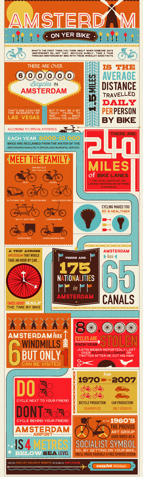 Infografia criada por Adam Spawton-Rice para a easyJet Holidays onde se promove a cidade de Amesterdão por uma das suas vertentes mais conhecidas, o ciclismo urbano. Descreve a atmosfera da cidade das bicicletas como “descontraída, agradável, e tão mainstream como se pode imaginar”. Ilustra um pouco da história controversa sobre a bicicleta como um símbolo da Holanda. Pleno de ironia, o conjunto de factos e mensagens que puxa o pedal ao nosso pé.