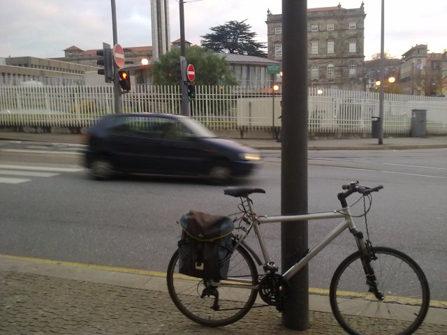 Hoje, mais uma vez fiz prova que na cidade a bicicleta é (ou pode ser!) mais rápida que o carro. O percurso é o mesmo, da Cidade Cooperativa da Prelada ao Hospital de Santo António. O casal meu vizinho sai pouco depois de mim da garagem do prédio no seu VW Polo azul e ultrapassa-me logo a seguir. – Deixá-los ir que não perdem pela demora!, regozijo. À passagem pelo Carvalhido dou com eles embrulhados no nó dos semáforos. Acho que já estarão resignados por serem ultrapassados por um ciclista maluco e perderem assim a “corrida”. Só no mês de Agosto, com muito menos trânsito nas ruas, me conseguem vencer. Chegado ao Hospital, desta vez paro e tento perceber o tempo que iriam demorar a passar. Tive de esperar uns bons minutos e ainda me deu tempo de registar o momento em fotografia.