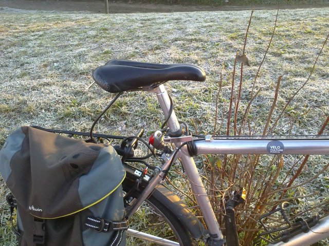 Os terrenos verdejantes entre a Alameda e o Parque da Prelada estavam hoje cobertos de um manto de geada que brilhava sob o sol amarelado que despontava. O movimento matinal estava no entanto um pouco estranho para o habitual. Os meus vizinhos, que deixam os carros ao relento, antes mesmo de ligarem o motor de arranque tiveram uma tarefa extra, de raspar o gelo dos pára-brisas. O vento frio cortava-me as orelhas mas eu iniciei a minha pedalada com satisfação, e um sorriso de quando eu também tinha essa tarefa ingrata de quebrar o gelo com as unhas para ver por onde conduzia!
