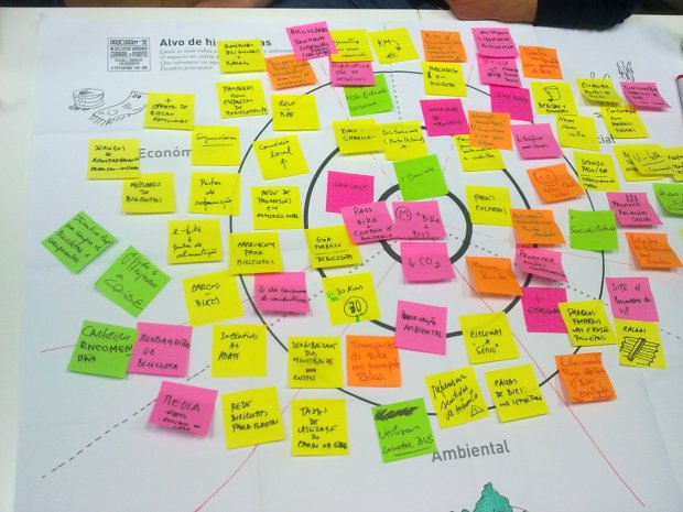 Não foram 10, foram 5 mas bons os ciclistas urbanos da Imbicta que se juntaram numa nova sessão de trabalho para a co-criação de ideias e soluções para estimular e facilitar a utilização da bicicleta como meio de transporte na cidade do Porto. Na continuação do trabalho iniciado pelos tolinhos dos mapas e ainda numa primeira fase, O João Sampaio, a Patrícia, o Ricardo, o Alexandre e moi-même, fomos colorindo o alvo de hierarquias com papeluchos e sarrabiscos onde a utilização urbana da bicicleta está presente.