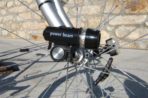 As luzes são um item essencial que deve equipar a bicicleta de cada ciclista urbano. Quando colocadas no guiador ou no guarda-lamas, as luzes pouco iluminam o pavimento por onde se pedala. Certamente que haverá uma série de soluções comerciais, mas quase todos elas serão muito caras. Pois o meu amigo Nuno criou uma solução em conta colocando um foco luminoso acoplado aos ilhós da forqueta da sua bicicleta. Com um par de baratos cabides de casa de banho “Grunthal”, alguns espaçadores de v-brakes, uma anilha, um parafuso M5 e respectiva porca. Aqui podem ver o gadget ao pormenor.