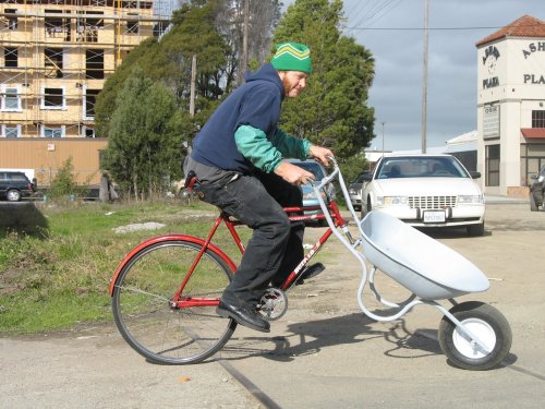 Este tipo cruzou uma bicicleta com um carrinho de mão! Não se sabe se foi por necessidade ou mero passatempo, o que se pode ver é que imaginação e alguma dose de loucura não lhe faltam. Pelo menos não lhe faltou criatividade e gostei de ver a adaptação que fez para unir os dois objectos. Quer me parecer que aquilo não passa de um brinquedo para impressionar as garinas. O ângulo do carrinho não permite carregar quase nada e é até perigoso pedalar aquela coisa pela rua. A única vantagem que consigo descortinar é, caso atropele alguém, o infortunado, ou afortunado, ficar sentado e assim fazer uma viagem de borla.