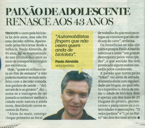 A contar com o ovo no cu da galinha, neste caso no scan da maquineta digitalizadora do gabinete, o que não se verificou nem à força bruta da porrada e de um pontapé ela colaborou, não desisti e fui matar o bicho na Adega do Velho Lau onde gamei as fotos da imprensa deste fim-de-semana. Não se fala de outra coisa, são seis paginas completas sob o tema do momento, o ciclismo urbano. Podem encontrar na Time Out Porto de Abril uma volta completa ao Porto em bicicleta e na edição de Sábado do JN, com chamada de capa e duas páginas inteirinhas, logo a seguir à secção de necrologia, o movimento velocipédico da Imbicta. Nem a propósito, na edição de hoje fala-se na falência das gasolineiras!!!