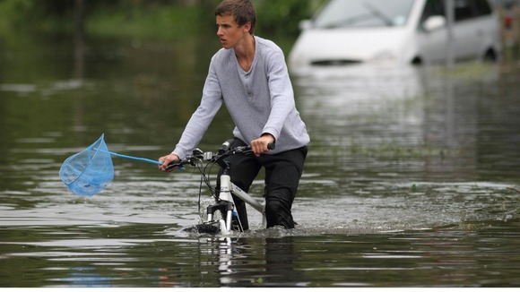 Two boys don’t seem to mind cycling through flood water in Felpham, Bognor Regis while a red car is stranded in the water