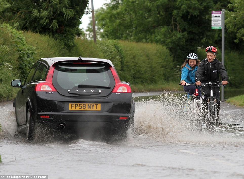 Elsewhere, Two bike riders narrowly avoid a soaking as a nearby motorist negotiates a partially-flooded road in Scropton, Derbyshire, today