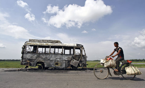 A man rides a bicycle in front of a bus that was burnt by a mob on the national highway near Rongia town in the northeastern Indian state of Assam. Photograph: Utpal Baruah/Reuters. (source)