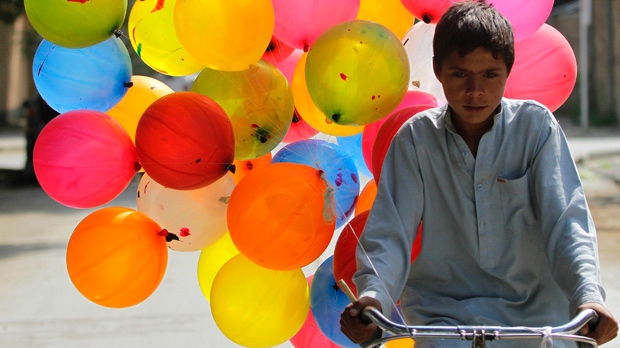 Ahmad Jawed, 13, rides a bicycle loaded with balloons along a road in Kabul, Afghanistan, Friday, Aug, 17, 2012. AP Photo/Ahmad Jamshid (source)