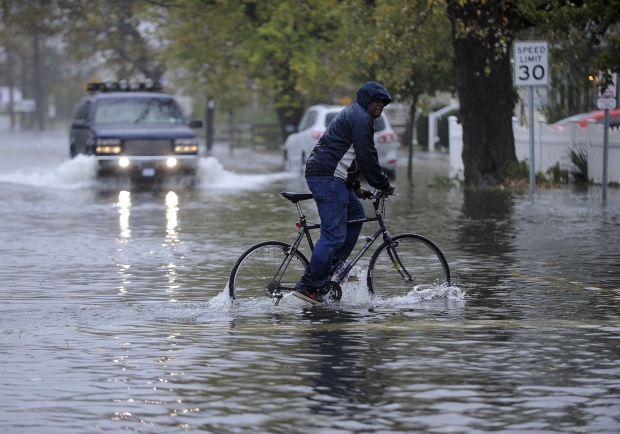 A resident bikes through a flooded street in Bay Shore, N.Y. (star-telegram.com)