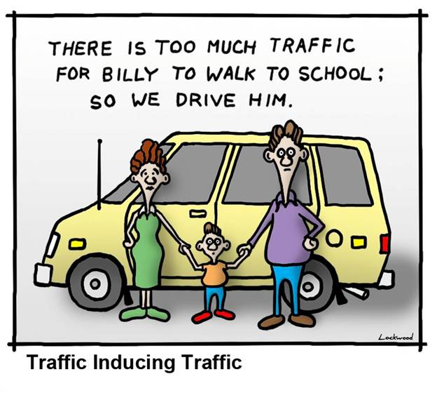 Já a insegurança rodoviária é um verdadeiro paradigma, um contrassenso. Pergunte para uma mãe porque ela não deixa o filho (mais crescido claro, não vamos falar aqui de bebês) ir para escola a pé ou de bicicleta, acompanhado de um amigo ou mesmo acompanhado por ela. Ela vai dizer que é muito perigoso, os carros são muito rápidos e não respeitam os pedestres/peões, logo a única solução segura é ir de carro. Como diz na foto abaixo: “Há muito tráfego para o Billy ir a pé para a escola; portanto nós o levamos de carro.”