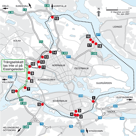 Preço: Variável conforme a hora do dia. De SEK10/€1,14/R$3,66 a SEK20/€2,28/R$7,31 por passagem. Ou seja, se paga no mínimo duas vezes: a cada passagem por um controlador na entrada e saída.