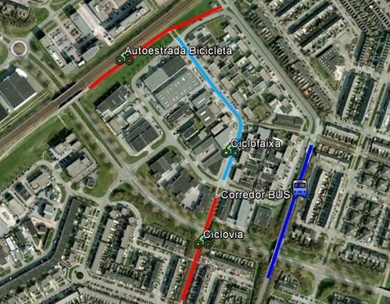 Outro exemplo de Almere: Na foto a seguir uma zona residencial de baixa densidade (para padrões holandeses) com um aprazível ambiente, muito verde e água. Em vermelho está o percurso para bicicletas partilhado + segregado (ponte) + partilhado. Em preto está o percurso para o automóvel, muito menos óbvio. Em azul o corredor BUS MAXX. Neste pequeno exemplo está resumido a essência de Almere: Baixa densidade (mas nem tanto), muita natureza, boa oferta de todos os meios de transporte.