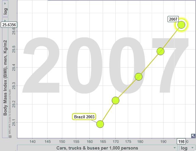Muito rapidamente pode-se perceber uma tendência forte de correlação entre os dois indicadores. Quase todos os países (eu só destaquei alguns, os demais estão mais apagados) com elevada taxa de motorização apresentam IMC alto, com os EUA no topo, sem dúvida o país mais auto-dependente de todos e verdadeiramente construído para viabilizar a acessibilidade universal ao automóvel.