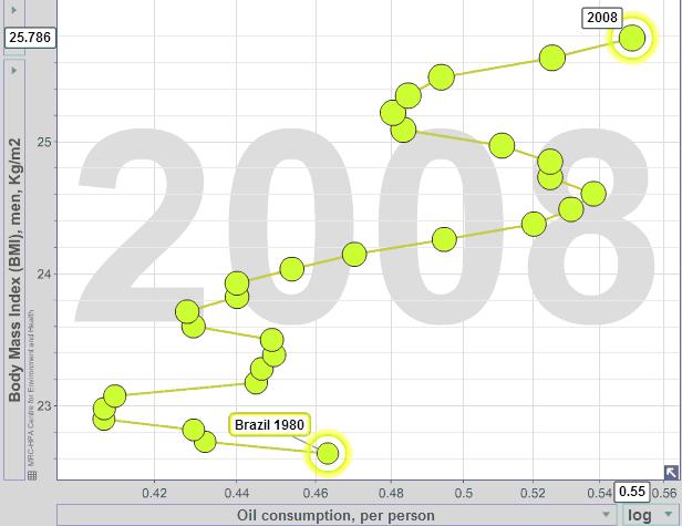 Eu poderia ter buscado outras fontes mais desagregadas, ao nível da cidade, que representassem melhor os efeitos de causalidade. Dois outros indicadores importantes que poderiam ser confrontados com o IMC são: Densidade populacional4,5,6 (hab./km2) e divisão modal. Como este texto não é um trabalho académico e como no Gapminder não existe muitos indicadores relativos aos transportes, acredito que esses 3 são os que melhores representam o comportamento de uma população automóvel-dependente.