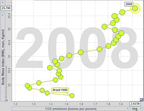 A relação com a geração de CO2 e o IMC é muito semelhante ao consumo de petróleo. Tanto para Portugal quanto para o Brasil o aumento na geração de CO2 e o IMC não seguem uma relação muito clara, porém se compararmos o primeiro ano (1980) com o último (2008) definitivamente vemos que os dois indicadores aumentaram. Também aqui não encontrei grande pesquisa no assunto. Encontrei porém um “News Alert” da Comissão Europeia (http://ec.europa.eu/environment/integration/research/newsalert/pdf/304na4.pdf) referindo que o excesso de peso está estatisticamente associado com maior geração de CO2. Esse documento ainda afirma que pessoas obesas geralmente tendem a usar mais o automóvel e possuir automóveis maiores e mais poluentes.