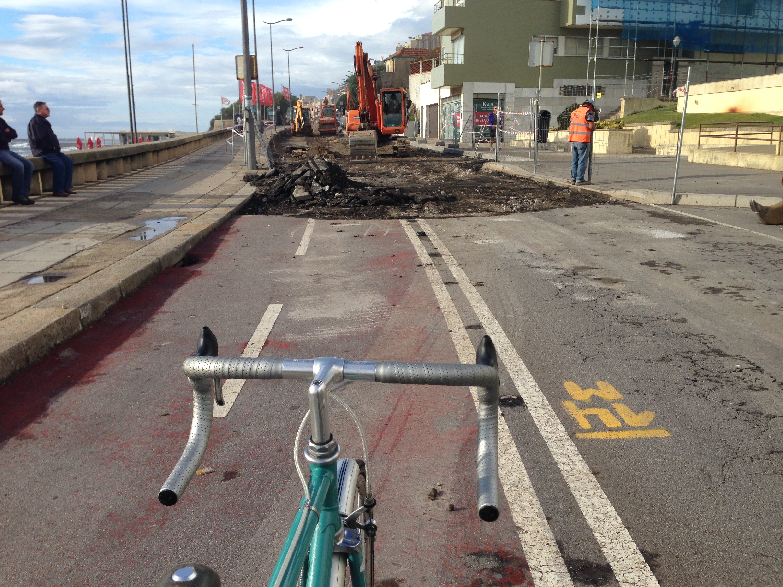 Ontem, ao regressar a casa via Foz do Douro, percebi finalmente poque haviam retirado os pilaretes da ciclovia da Rua Coronel Raúl Peres, um dos únicos troços de ciclovia de jeito que conheço no Porto. A rua encontra-se totalmente fechada ao trânsito, situação que estará resolvida em aproximadamente três semanas, refere o site da CMP. Para entrar na Avenida do Brasil, a alternativa ao pessoal das pedaladas é seguir pela Rua do Passeio Alegre. Quem vier da “ciclovia” da Avenida do Brasil para a Avenida D. Carlos resta-lhe expremer-se nos passeios com os peões.
