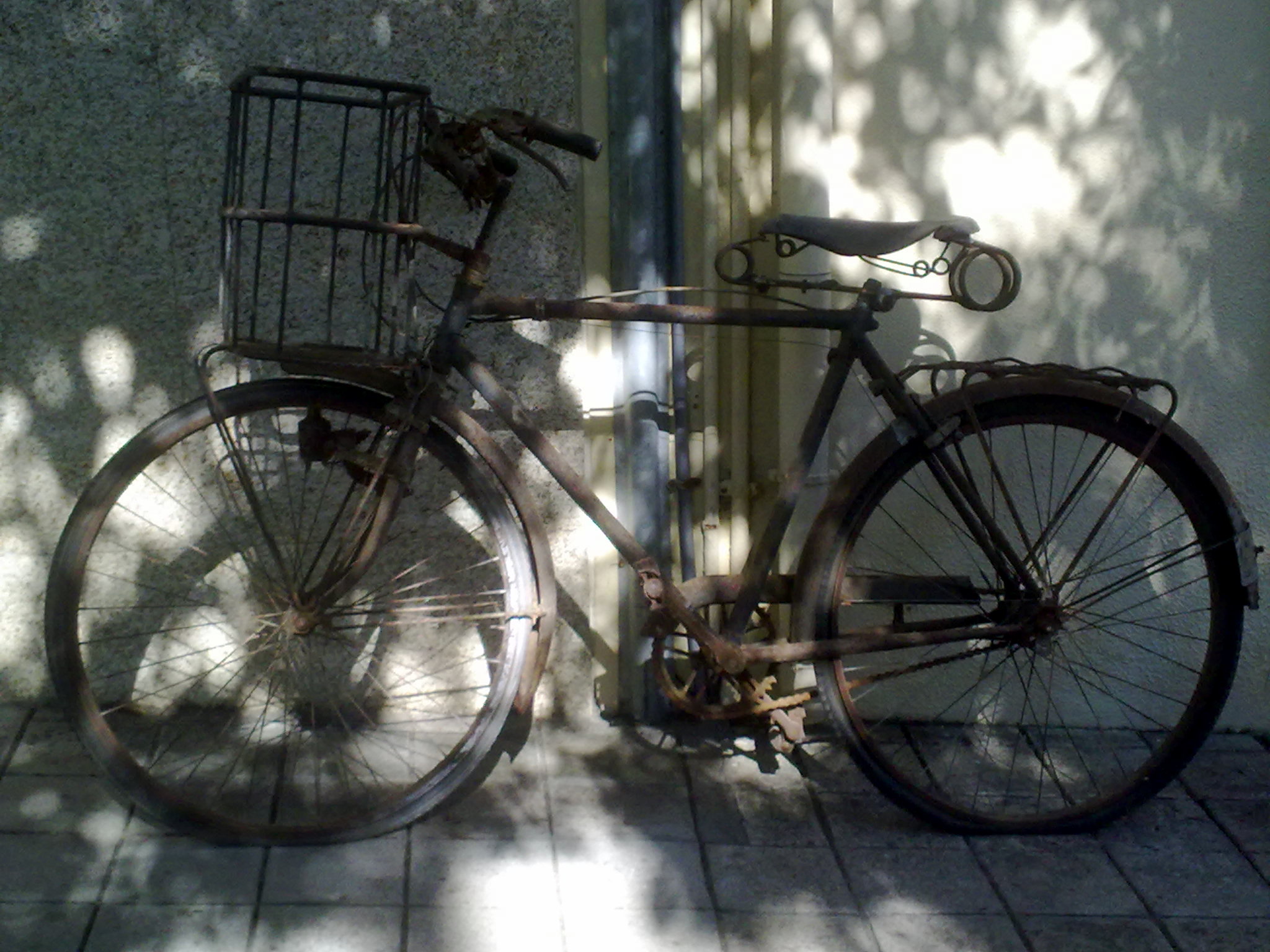 Nem sempre posso prever o que vai me inspirar a escrita, um texto, uma situação que mereça ser contada e publicada. Alguma coisa que me lembre uma passagem, talvez da infância, talvez de um outro momento qualquer. Basta um objecto, uma cena testemunhada, especialmente nesse momento que tenho a companhia oportuna da minha bicicleta. Imagino que já deram conta disso! Entre cenas do quotidiano que me chamam a atenção, um pouco ao acaso, naquele momento em que ia ao Monte da Luz e a pé subia a Rua do Farol, detive-me por alguns instantes a olhar para uma velha bicicleta coberta de ferrugem. Abandonada ou simplesmente estacionada, aquela antiga bicicleta carcomida pelo tempo provocou-me um certo fascínio. Não estava presa a nada, apenas deixada ali, no passeio, encostada à parede sombria. Não tive como não deixar de associar aquela velha pasteleira à vasta serventia que com o seu dono, ou donos, se viu envolvida. Parecia ter sido deixada ali, naquele lugar, como um objecto decorativo, uma função diferente tornando-a visível, retirando-a do esquecimento. Quem sabe se à espera de uma nova vida! Quem sabe… O registo fotográfico tinha, então, uma função inspiradora, a imagem como elo de ligação ao contexto, a motivação para este texto. Apontei-lhe a micro-objectiva do telemóvel, periclitante, como se estivesse a invadir a sua privacidade. Não havia ainda recebido o aviso sonoro da autofocagem quando sinto perto de mim uma presença humana, que me ia observando. Na porta da loja, mesmo ao lado, estava um velhote curioso naquilo que eu andava a fazer. Talvez fosse o dono daquele monte de ferrugem, não sei, mesmo assim senti-me na obrigação de pedir permissão para tirar o retrato. “Ahh… esteja à vontade!”. Então, com a sua licença…