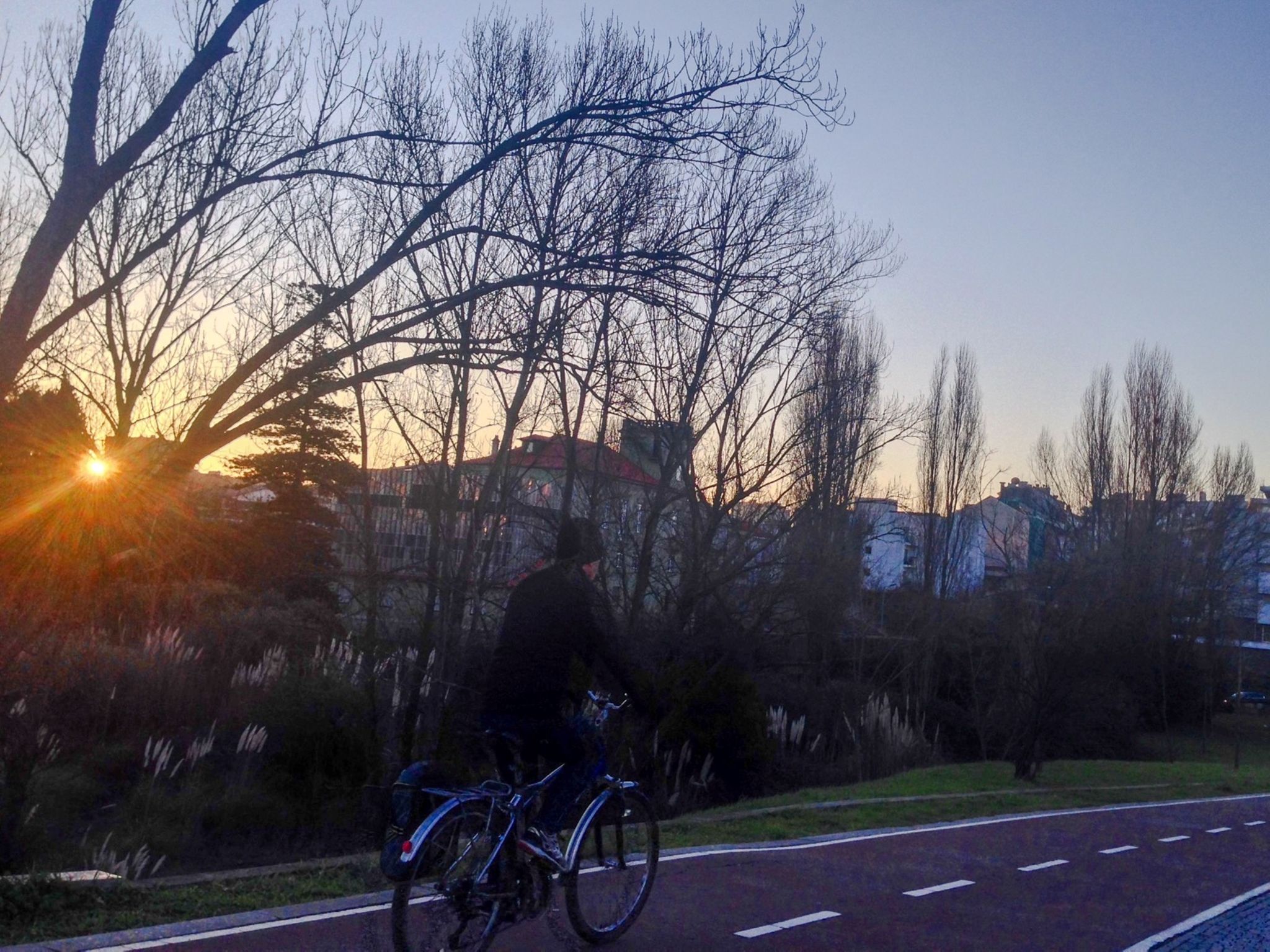 Na bicicleta o frio não se estranha, entranha-se. Afinal estamos no Inverno, o que não é de estranhar portanto que mesmo enchouriçado de roupa mal coloque o nariz fora da porta sinta um arrepio na espinha. O dia desponta bonito, mas não eram aqueles imberbes raios de sol reluzindo no alumínio da bicicleta que me fariam aquecer. Ao pedalar bem cedo para o trabalho, ou outro sítio qualquer, estamos livres e ao mesmo tempo expostos aos elementos matinais. De luvas térmicas e gorro enfiado a tapar as orelhas, mais que preparado para enfrentar este briol, dou as primeiras pedaladas do dia. O ar gelado morde-me a pele, penetra nas narinas e arrefece os pulmões. Rajadas de vento d’Este esbofeteiam-me o rosto e acordam-me de vez. Automaticamente levanto o rabo do selim, activo as pernas para dar ritmo aos pedais. Escalo ao topo da montanha, neste caso o viaduto sobre a VCI. Encolho-me no cachecol e prossigo, fungando. Lentamente a energia da pedalada reconforta, o movimento pedaleiro revigora e equilibra-me os níveis de humor. Ao arredondar a primeira curva já sinto a diferença com o corpo a aquecer, mas que está um frio do carago, lá isso está!