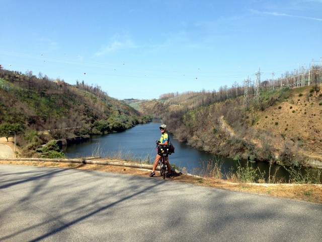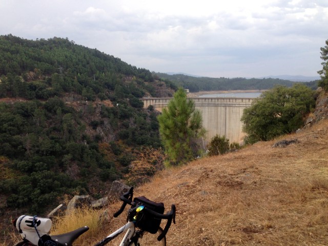 Cruzo o Rio Zêzere pela imponente Barragem do Cabril. Voltam as montanhas, as encostas abruptas e a terra incendiada. Antes de chegar à Sertã, um episódio curioso. Após uma das curvas surge um duo a pedalar, uma senhora com uma saca de laranjas na mão e à sua frente um rapazito segue na sua bicla roda 16. Não resisto e tiro uma foto à paparazzi. Passo por eles e o rapazito segue a minha roda. Abrando e olho para ele, todo contente a admirar os bidons que trazia presos à mala: “Olha lá, queres ficar com um?” A cara do miúdo iluminou-se, acenou afirmativamente com a cabeça, e então atiro-lhe… “Dás-me uma laranja e eu dou-te um. Pode ser?”. Negócio feito.