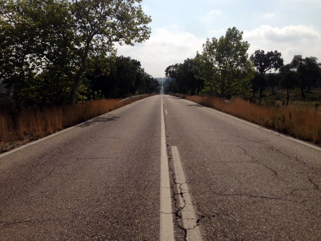 Sopra um vento fresco de frente e cruzo-me com pequenos pelotões de ciclistas amadores em treino matinal. Tomada a dose de cafeína, os neurónios e as pernas acordam finalmente. O sol começa a dar alguns sinais da sua graça. Rodei, rolei, subi, desci, sempre na maior das calmas. A paisagem muda muito outra vez. Sucedem-se as herdades, as ondulantes rectas e as tímidas curvas. Atravesso os primeiros montados com pequenas florestas de sobreiros e carvalhos. O panorama é soberbo e emocionante. Bemposta e Ponte de Sor para trás, à sombra de um sobreiro, em Água de Todo o Ano, uma paragem técnica, o local ideal para verter águas.