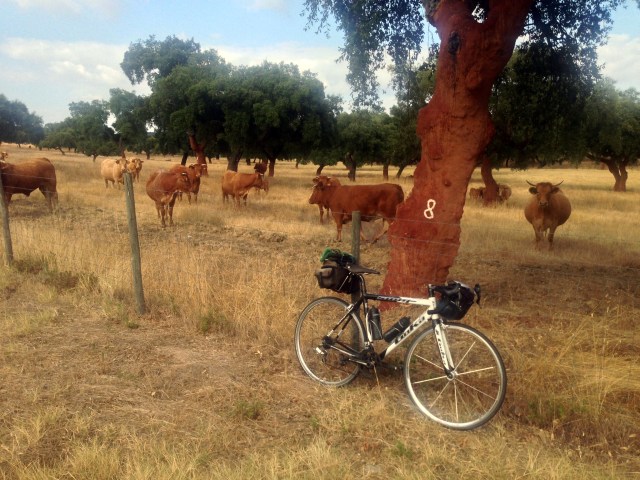 Nas vastas herdades alentejanas muitos dos sobreiros foram recentemente descortiçados. Depois de arrancada a cortiça do tronco, o sobreiro apresenta uma cor avermelhada, que passa a castanho escuro à medida que as árvores vão regenerando a casca. Para se saber o ano em que tiraram a cortiça, os trabalhadores marcam na árvore a tinta branca o ano. Vacas, várias delas prenhas, e bezerros vagueiam pelos campos cercados, com pasto à disposição, sem receio de se aproximarem para “conhecer” o estranho visitante. Bem tentei mas não me responderam à pergunta pela Vaca Que Ri. É que um queijinho vinha mesmo a calhar.