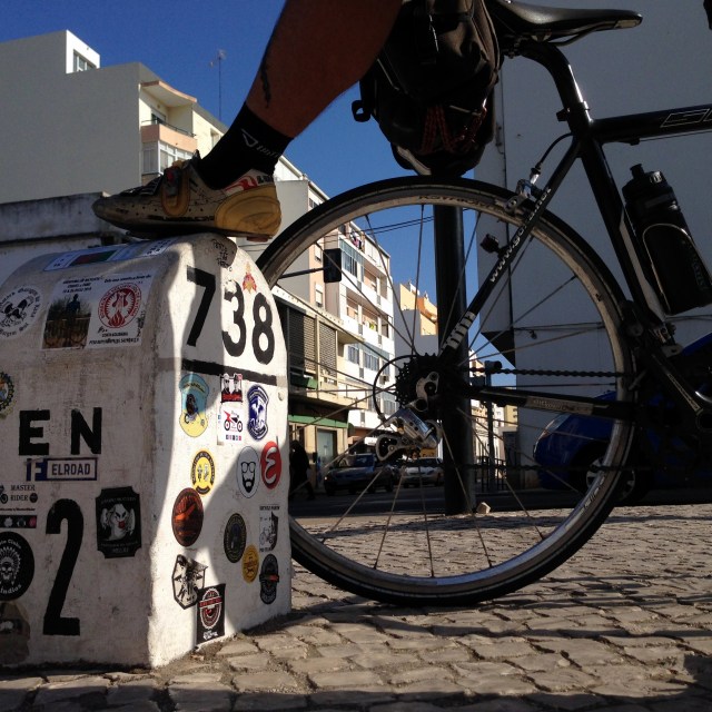 O marco final está plantado no meio de uma avenida para o interior da cidade. Ali está ele, o quilómetro 738, no passeio calcetado, branco, coberto de autocolantes, triste e só, sem púlpito, sem pódio, e eu corto a meta, sem champanhe, sem beijinhos nem meninas. Feitas as fotos, confortamo-nos mutuamente, por alguns minutos. Na hora da chegada não esqueci o Jacinto e o quanto teria prezado terminar esta viajem na sua companhia. Sem um autocolante para assinalar “a nossa chegada”, vandalizei o meco com os nossos nomes e a data.