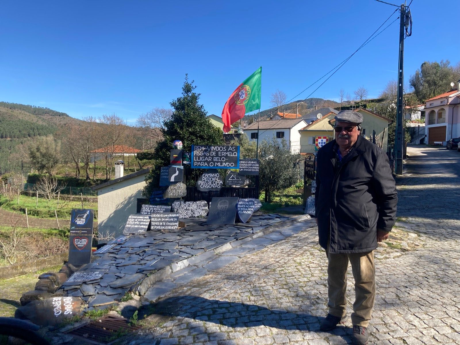 À passagem pela aldeia de Ermelo ficamos encantados com a mostra de ardósias de xisto, alindadas com dedicatórias deixadas por caminhantes e visitantes dos trilhos. Subitamente surge o proprietário da casa e fiquei à conversa. O Sr. Carlos Rodrigues Sousa, ilustre poeta, é um apaixonado pela sua aldeia, orgulhoso da cultura e história da região.